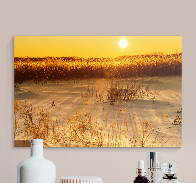 Ervaar de magie van de natuur met ons Canvas landschap gouden zonsopgang. Dit prachtige ontwerp vangt de schoonheid van pampasgras dat zachtjes waait in de wind, omringd door uitgestrekte velden die baden in een warme, gouden gloed van de opkomende zon. De reflectie van de zon op de planten en het gras creëert een serene en inspirerende sfeer die elke ruimte kan transformeren in een oase van rust.