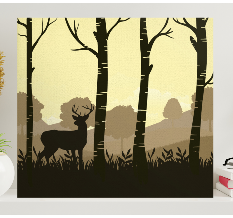 Ontdek de schoonheid van de natuur met ons Canvas schilderij herten silhouet van een hert tussen bomen. Dit prachtige ontwerp toont een elegant hert dat zich tussen majestueuze bomen bevindt, omringd door weelderig gras en gebladerte. De afbeelding vangt de essentie van het woud en brengt een stukje natuur en dieren in het wild in uw interieur. Het silhouet van het hert tegen de achtergrond van bomen creëert een serene en rustgevende sfeer, perfect voor elke ruimte in uw huis.