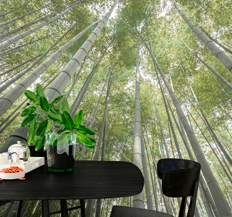 Referentienummer: F12097Het ontwerp toont een torenhoge bamboebos gezien vanuit onderen, met lange, slanke bamboestengels die omhoog reiken. De weelderige groene bladeren filteren het licht zachtjes, waardoor een serene sfeer ontstaat, perfect voor degenen die een verbinding met de natuur zoeken.