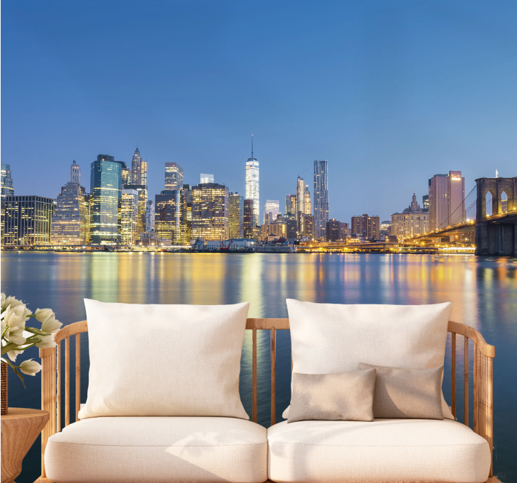 Referentienummer: F12099Het ontwerp toont een adembenemend uitzicht op de skyline van New York, met iconische gebouwen die bij schemering verlicht zijn. De scène omvat de Brooklyn Bridge die elegant over het water boogt, aangevuld met levendige stadslichten die op het oppervlak reflecteren, wat een schilderachtige sfeer creëert.