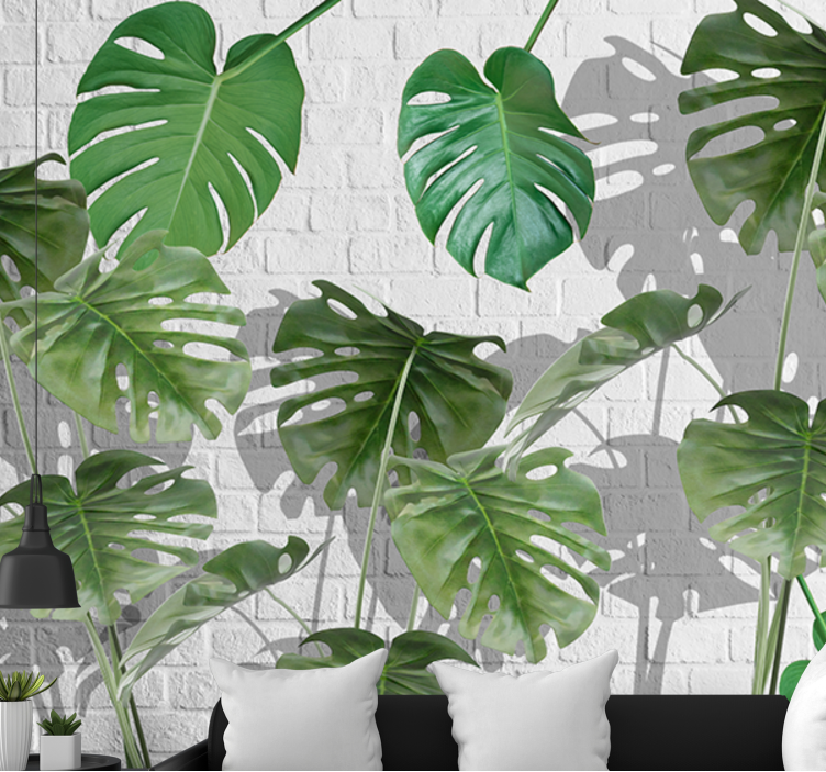 Referentienummer: F12051Een elegante display van monstera bladeren is prominent aanwezig tegen een witte bakstenen achtergrond. De ingewikkelde vormen en patronen van de bladeren creëren een levendige en verfrissende sfeer, waardoor een vleugje natuur en vitaliteit aan elke ruimte wordt toegevoegd.