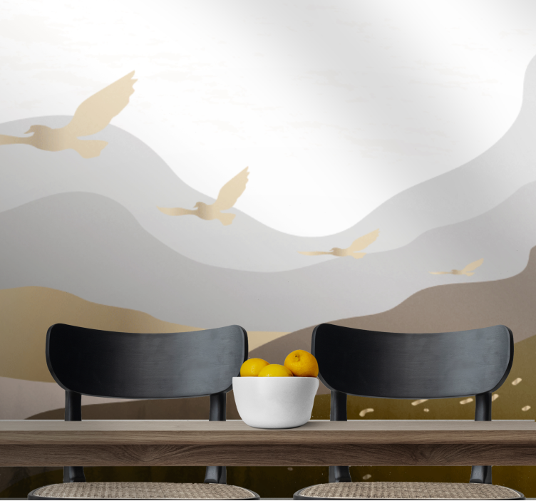 Breng de schoonheid van de natuur in uw interieur met ons unieke Natuur behang vliegende vogels silhouetten. Dit prachtige ontwerp toont een harmonieuze illustratie van vogel silhouetten die elegant over majestueuze bergen zweven. De gouden tinten stralen warmte uit en creëren een serene sfeer die perfect is voor elke ruimte. Dit behang is meer dan alleen een decoratief element; het is een kunstwerk dat de rust van de natuur in uw huis brengt.