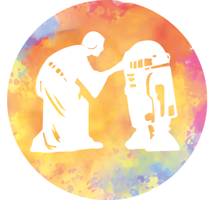 Referentienummer: B3781Een opvallende silhouet van een personage dat interactie heeft met een robot staat tegen een levendige, abstracte achtergrond. Het ontwerp vangt een moment van verbinding te midden van een kleurrijk palet dat een gevoel van avontuur en verbeelding oproept.