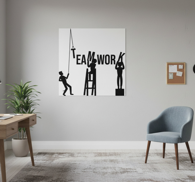 Deze afbeelding toont een artistieke weergave van teamwork, met drie figuren die samenwerken om het woord 'TEAMWORK' te vormen. Het ontwerp weerspiegelt eenheid en samenwerking, met contrasterende silhouetten tegen een minimalistische achtergrond, waardoor een motiverende sfeer voor werkruimtes wordt gecreëerd en een geest van samenwerking wordt bevorderd. Poster kantoor teamwork poster voor kantoor eenvoudig door dubbelzijdig plakband op de achterkant aan te brengen. Je kunt de poster ook inlijsten voor een strakkere afwerking. Bevestig de strips op de achterkant en houd ze stevig vast voor een perfecte hechting. Punaises of herbruikbare blu-tack zijn ook uitstekende opties voor een flexibele bevestiging!