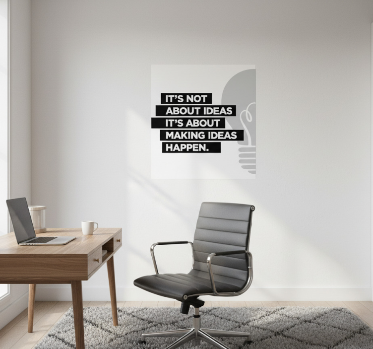 Een stijlvolle thuiswerkplek heeft een slanke zwarte stoel naast een houten bureau. Een laptop staat op de tafel, vergezeld van een koffiekopje. Aan de muur benadrukt een inspirerende poster actie, met de tekst dat het niet alleen om ideeën gaat, maar om hun realisatie. De moderne esthetiek bevordert creativiteit.