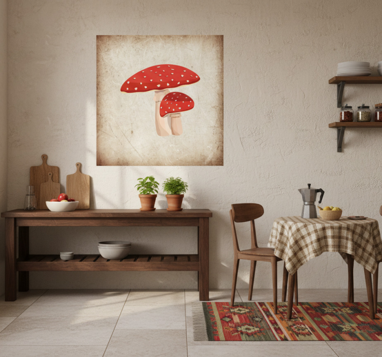 De Poster keuken amanita paddenstoel illustratie poster keuken is niet alleen een decoratief element, maar ook een bron van inspiratie. Het brengt een organische charme in uw ruimte en nodigt uit tot creativiteit in de keuken. Door de sprankelende kleuren en het unieke ontwerp voegt deze poster een speelse touch toe aan uw interieur, waardoor elke maaltijd een feest wordt!
