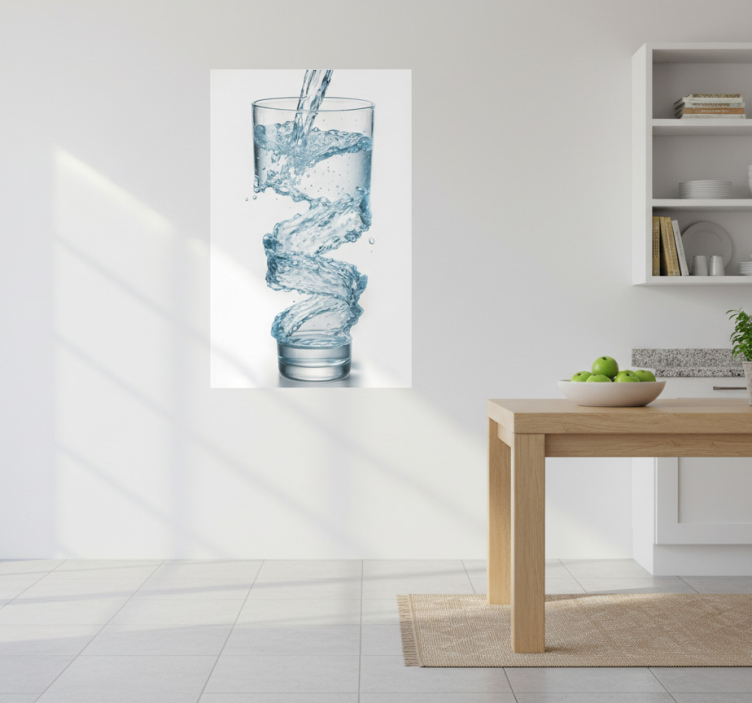 De afbeelding toont een helder glas gevuld met draaiend water, dat beweging en vloeibaarheid vastlegt. De dynamische patronen van de vloeistof creëren een boeiend visueel contrast tegen een minimalistische achtergrond. Zonlicht verlicht de scène en versterkt het verfrissende uiterlijk van het water, perfect om hydratatie en vitaliteit over te brengen. Poster keuken glas water keuken poster eenvoudig aanbrengen met dubbelzijdig plakband voor een strakke afwerking. Alternatieven zoals punaises of herbruikbare blu-tack zijn ook beschikbaar voor een flexibele en creatieve presentatie. Maak het jezelf gemakkelijk en geniet van de frisse uitstraling die deze poster biedt!