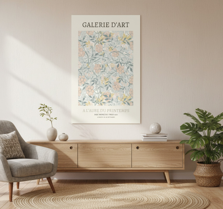 Dit beeld toont een elegant wandkunstwerk getiteld 'A L'Aube du Printemps,' met ingewikkelde bloemmotieven in zachte pasteltinten. De kunstprint is prominent boven een minimalistisch houten dressoir geplaatst, wat de hedendaagse interieurdecoratie versterkt. Een stijlvolle fauteuil en een potplant voegen warmte toe aan de uitnodigende sfeer.