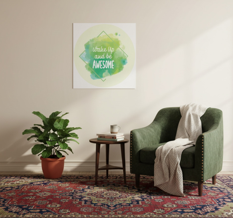 Een gezellige hoek heeft een levendig groene stoel versierd met een zachte deken, die uitnodigt tot ontspanning. Dichtbij staat een kleine tafel met een elegante mok en gestapelde boeken. Een weelderige potplant voegt leven toe, terwijl een kleurrijk vloerkleed de warmte versterkt. Boven hangt een inspirerend aquarel kunstwerk dat een positieve mindset aanmoedigt.