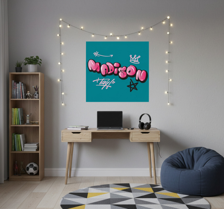 Referentienummer: G1046Maak kennis met onze Poster tienerkamer creatief naamontwerp! Dit unieke ontwerp is een waar kunstwerk dat perfect is voor elke tienerkamer. De poster heeft een 180g/m2 grammage wat zorgt voor een luxe uitstraling en een halfmatte finish zonder reflecties. De hoge kleurintensiteit brengt levendigheid en energie in de ruimte, waardoor het een geweldige aanvulling is op de persoonlijke stijl van elke tiener!