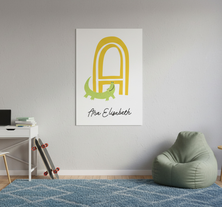 Deze vrolijke illustratie toont een grote gele letter 'A' vergezeld door een speelse groene krokodil eronder. De naam 'Ana Elisabeth' is elegant geschreven in een stijlvolle lettertype, wat het speelse thema versterkt. Het algehele ontwerp straalt een blije en kindvriendelijke sfeer uit, perfect voor een levendige inrichting in een kinderkamer.