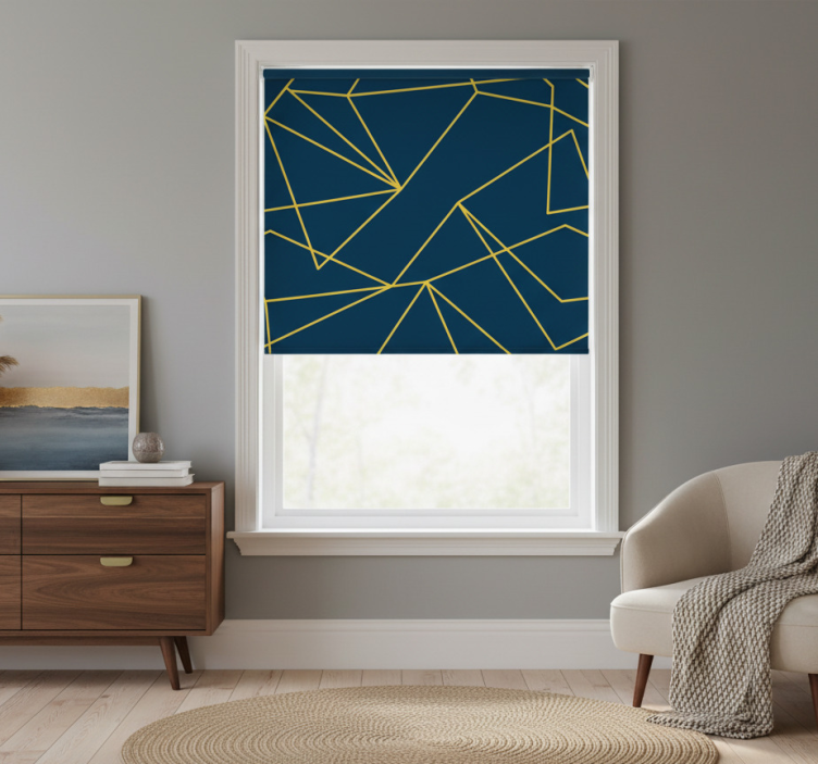 Referentienummer: E9136Blauw rolgordijn met geometrische gouden lijnen