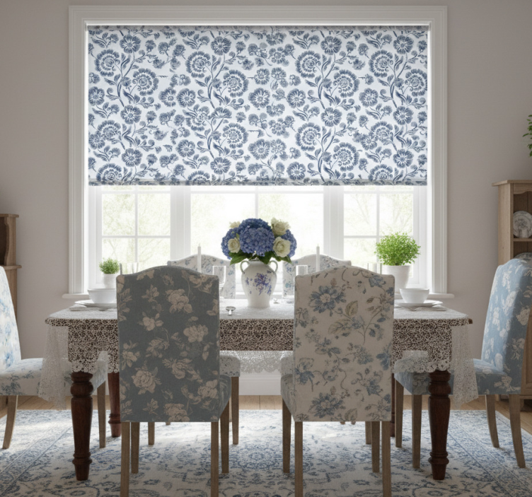 Eetkamer rolgordijn blauwe bloemen grandmillenial patroon