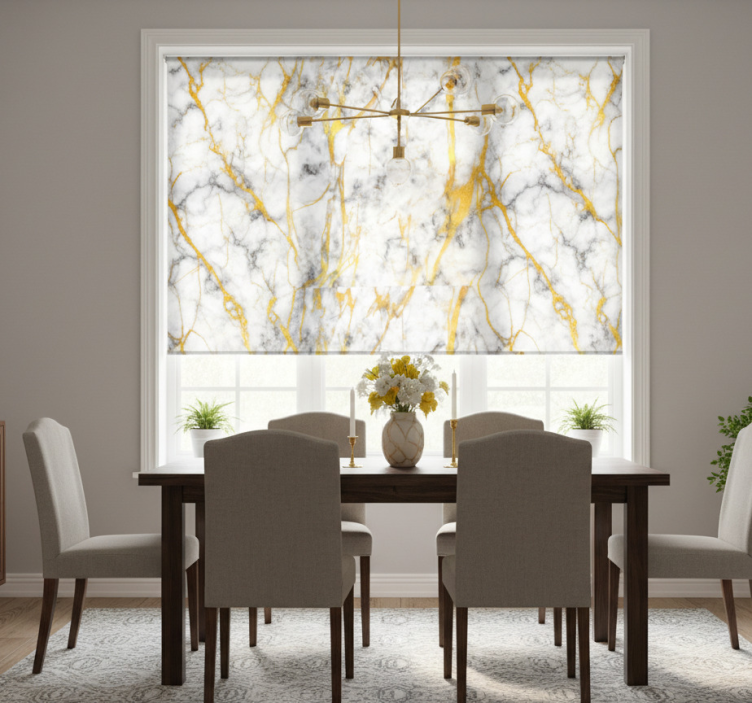 Eetkamer rolgordijn elegant grijs en gouden marmer