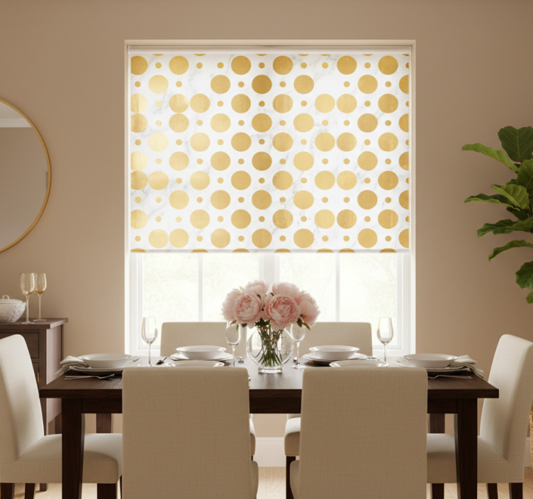Een Eetkamer rolgordijn gouden marmer stippen eetkamer rolgordijn is meer dan alleen een praktische oplossing voor privacy en zonwering; het is een statement piece dat de uitstraling van uw eetkamer compleet kan veranderen! Met zijn unieke ontwerp trekt het de aandacht en voegt het karakter toe aan uw ruimte. Het biedt niet alleen bescherming tegen direct zonlicht, maar helpt ook de kamertemperatuur te reguleren, wat resulteert in een aangename eetervaring voor u en uw gasten. Laat uw creativiteit de vrije loop en maak van uw eetkamer een waar kunstwerk!