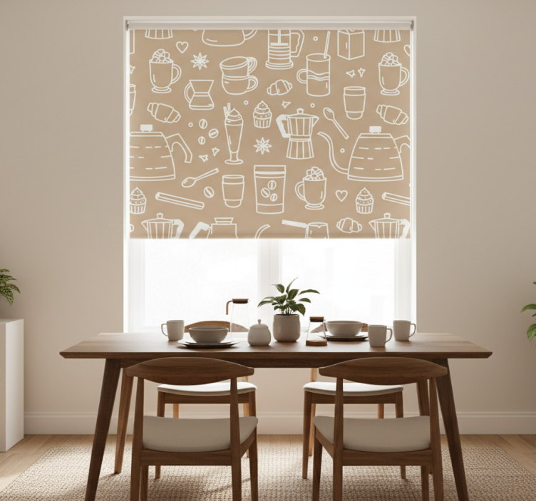 Eetkamer rolgordijn met koffie kopjes en glazen patroon