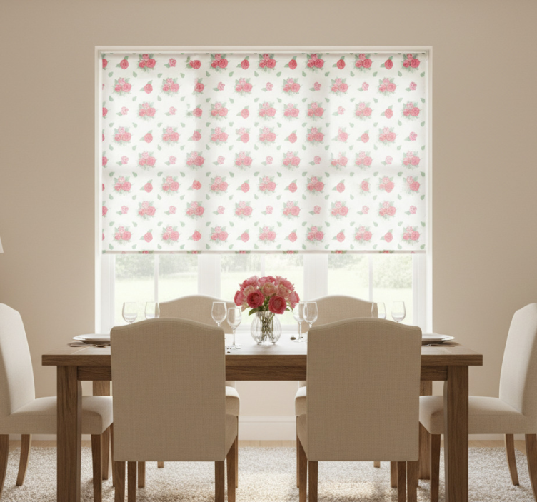 Eetkamer rolgordijn met roze en rode rozenpatroon