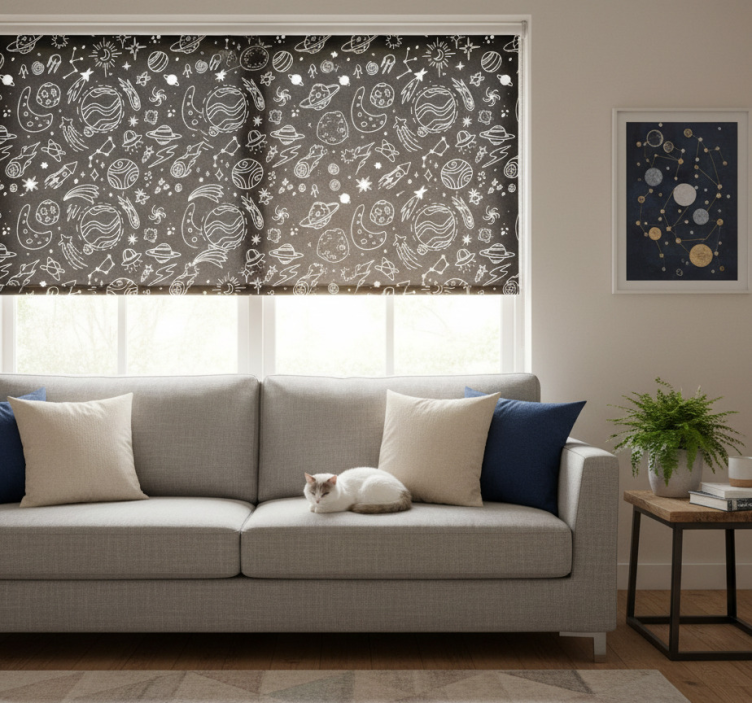 Referentienummer: E7748Moderne raambekleding met zwart-witte kosmische illustraties