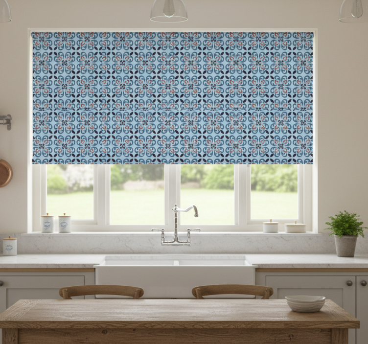 Referentienummer: E6400Rolgordijn keuken babyblauwe ronde portugese tegel