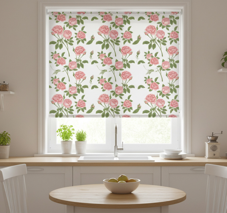 Laat uw keuken stralen met ons rolgordijn keuken bloemenprint rozen, dat een prachtig grafisch ontwerp van bloeiende rozen met levendige kleuren toevoegt aan uw interieur. Dit rolgordijn is niet alleen een lust voor het oog, maar ook functioneel, met een structuur die licht filtert en privacy biedt. Het is ontworpen om de sfeer van uw keuken te verbeteren, waardoor het een perfecte aanvulling is op elke stijl.