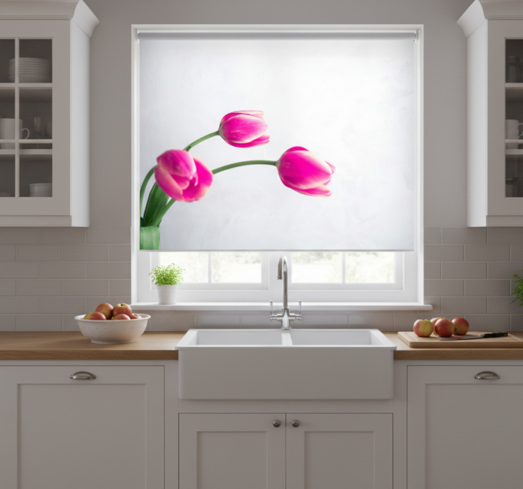 Breng een vleugje elegantie in uw keuken met ons rolgordijn keuken drie tulpen op witte achtergrond. Dit prachtige ontwerp toont drie delicate tulpen die prachtig afsteken tegen een frisse, witte achtergrond. De combinatie van de kleurrijke bloemen en de neutrale basis zorgt voor een levendige, maar toch rustige uitstraling. Het rolgordijn is niet alleen een visueel hoogtepunt, maar biedt ook praktische voordelen die elke keuken ten goede komen.