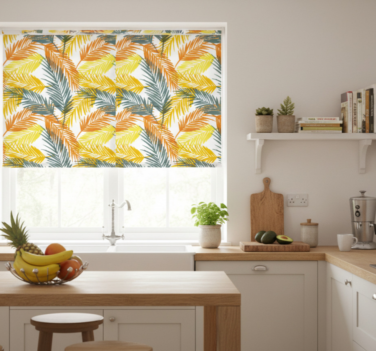 Een rolgordijn keuken palmbladeren tropisch patroon rolgordijn keuken is de perfecte decoratieve aanvulling voor iedere keuken. Het voegt niet alleen kleur en leven toe aan de ruimte, maar helpt ook om de algehele ambiance te verbeteren. Met dit rolgordijn voelt uw keuken warmer en uitnodigender aan, wat elke maaltijd een feestelijke touch geeft. Het is een eenvoudige manier om stijl en functionaliteit te combineren!