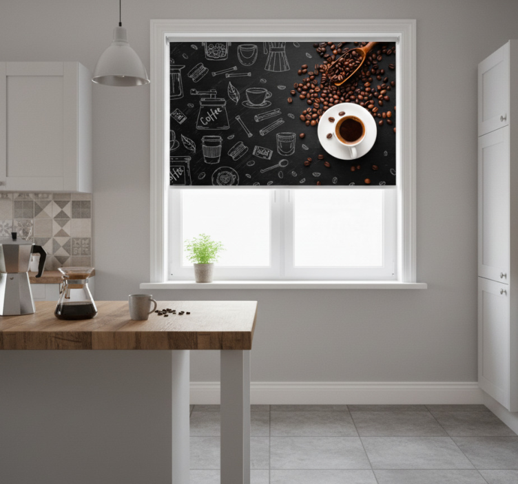 Referentienummer: E7955Rolgordijn keuken koffiebonen en krabbels
