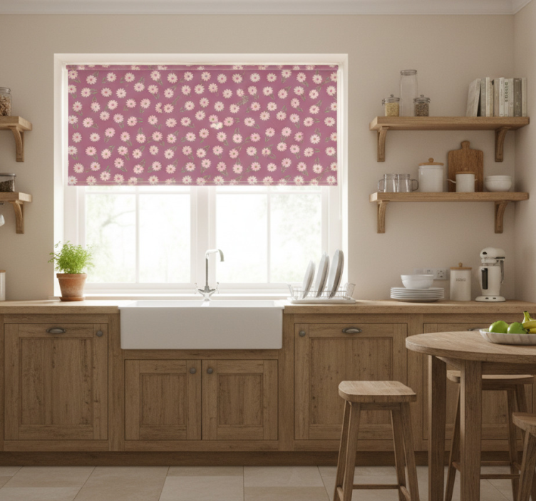 Rolgordijn keuken met patroon van kleine roze madeliefjes