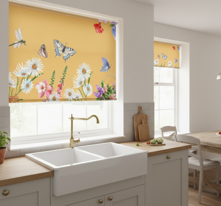 Rolgordijn keuken met schilderij van madeliefjes en vlinders