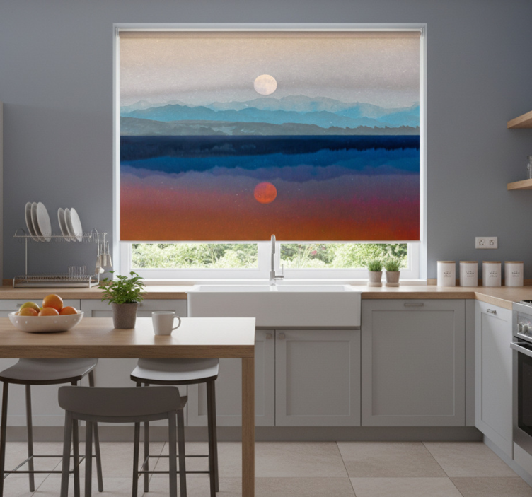 Een rolgordijn keuken ruimte mooi maan ontwerp rolgordijn keuken voegt niet alleen charme toe aan je keuken, maar biedt ook praktische voordelen. Het zorgt voor een stijlvolle uitstraling die de sfeer in de ruimte verbetert. Bij het omlaag laten biedt het privacy en beschermt het tegen fel zonlicht, waardoor je een aangename omgeving creëert om in te koken en te genieten. Dit rolgordijn is een perfecte mix van functionaliteit en esthetiek!