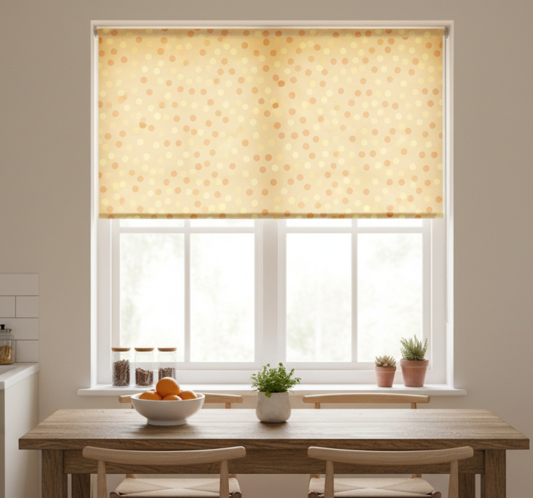Met het rolgordijn keuken sinaasappels in cirkels brengt u een speelse en frisse sfeer in uw keuken. Het ontwerp met vrolijke sinaasappels in cirkels zorgt voor een unieke uitstraling die de ruimte opvrolijkt. Dit rolgordijn is niet alleen een functionele toevoeging voor uw ramen, maar ook een stijlvol decoratief element dat perfect past in een moderne of klassieke keuken. De levendige kleuren en het frisse patroon maken het een echte blikvanger, terwijl het tegelijkertijd de privacy waarborgt en het zonlicht filtert. Laat uw keuken stralen met dit prachtige rolgordijn!