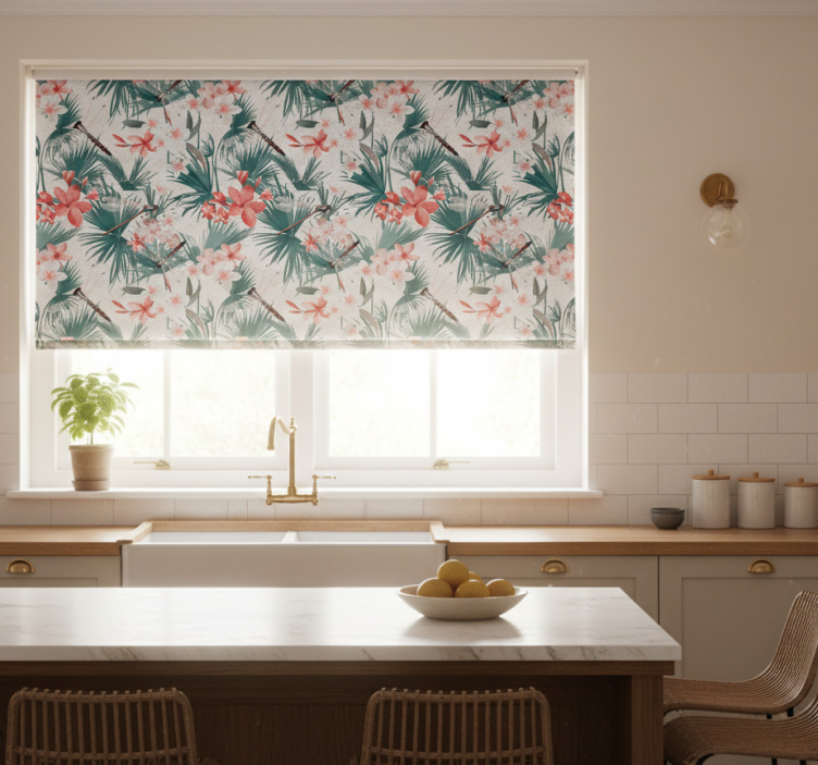 Een rolgordijn keuken tropische planten en bloemen rolgordijn keuken is meer dan alleen een praktische oplossing voor uw ramen; het is een statement piece dat uw keuken kan transformeren. Dit rolgordijn biedt niet alleen privacy en bescherming tegen de zon, maar het voegt ook een speelse en frisse uitstraling toe aan uw interieur. Laat de natuur binnenkomen en geniet van de sfeer die dit unieke ontwerp met zich meebrengt!