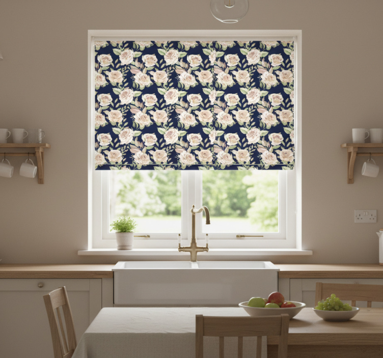 Een rolgordijn keuken vintage rozenpatroon op blauwe achtergrond rolgordijn keuken is een must-have voor iedereen die zijn keuken wil verfraaien. Het biedt niet alleen bescherming tegen de zon, maar voegt ook een uniek decoratief element toe aan uw interieur. Met zijn elegante design en vrolijke kleuren creëert dit rolgordijn een warme en uitnodigende sfeer. Het is de ideale manier om uw persoonlijke stijl uit te drukken en tegelijkertijd functionaliteit te waarborgen. Waarom wachten? Geef uw keuken een frisse uitstraling!