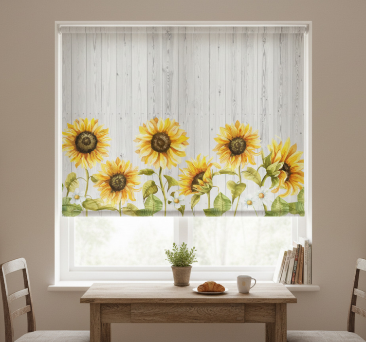 Het rolgordijn keuken zonnebloemen op grijze planken is een prachtig voorbeeld van hoe functionaliteit en esthetiek hand in hand gaan. Dit unieke ontwerp, met levendige zonnebloemen die contrasteren met de elegante grijze planken, brengt een vrolijke en uitnodigende sfeer in uw keuken. De combinatie van natuurlijke elementen en moderne accenten maakt dit rolgordijn een echte blikvanger in uw interieur.