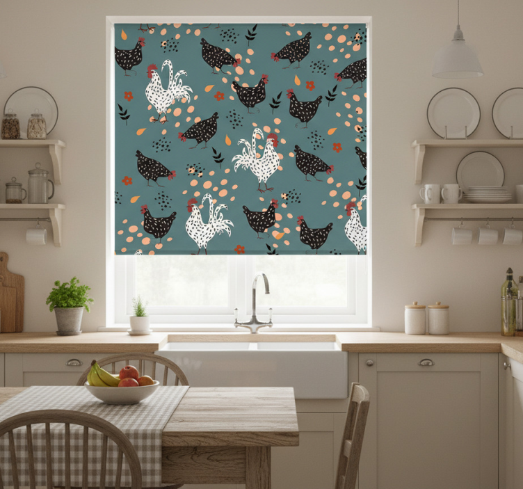 Het rolgordijn keuken zwart-witte kippen met bloemen rolgordijn keuken is niet alleen praktisch, maar ook een geweldige manier om uw keuken te verfraaien. Dit unieke ontwerp voegt een speelse touch toe aan uw ruimte en maakt het een uitnodigende plek om te koken en te genieten van maaltijden met vrienden en familie. Het rolgordijn biedt privacy en beschermt tegen fel zonlicht, terwijl het tegelijkertijd een decoratief element toevoegt aan uw keuken. Laat uw keuken stralen met dit charmante rolgordijn!