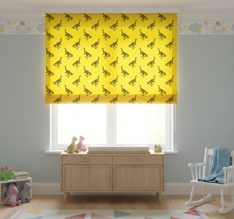Een rolgordijn kinderkamer brachiosaurus symbolen op geel rolgordijn biedt meer dan alleen privacy; het is een prachtig decoratief element dat de ruimte opvrolijkt! De levendige kleuren en speelse afbeeldingen creëren een vrolijke ambiance die de verbeelding van uw kind prikkelt. Het is perfect voor het inrichten van een gezellige en inspirerende omgeving, waar uw kind zich vrij voelt om te spelen en te leren. Bovendien helpt het rolgordijn om de kamer te beschermen tegen direct zonlicht, waardoor een comfortabele sfeer ontstaat voor alle activiteiten!