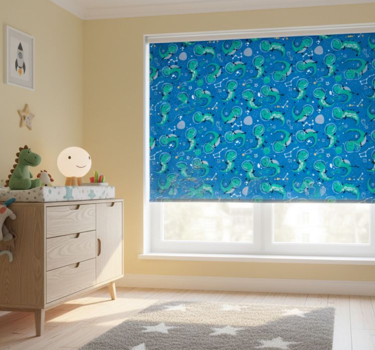Dit Rolgordijn kinderkamer grappige dino's met planeten is een speelse toevoeging aan elke kinderkamer! Met zijn levendige en kleurrijke ontwerp van schattige dino's die samen met sterren en planeten het raam sieren, brengt het een vrolijke sfeer in de ruimte. Het maakt de kamer niet alleen mooier, maar biedt ook functionaliteit en privacy. Dit rolgordijn is perfect om de creativiteit van uw kind te stimuleren en een omgeving te creëren waar dromen tot leven komen!