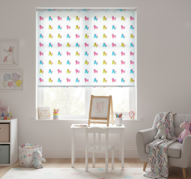 Rolgordijn kinderkamer eenhoorns op blauwe achtergrond