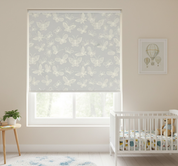Rolgordijn kinderkamer vlinderpatroon wit en grijs