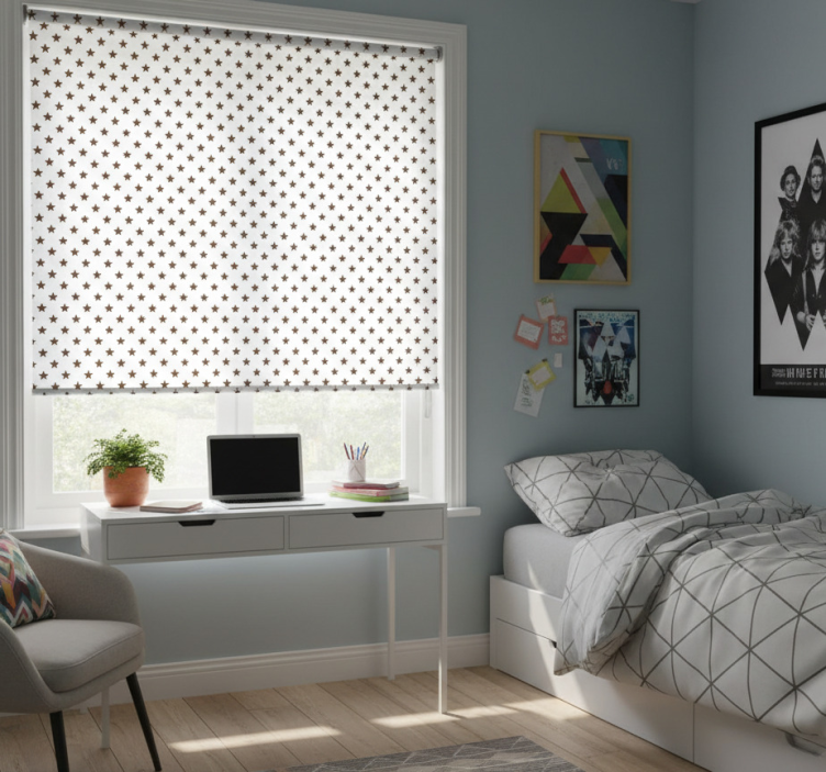 Ontdek het rolgordijn tienerkamer bruine sterren, een prachtig ontwerp dat de sfeer in elke tienerkamer zal transformeren. Dit rolgordijn is versierd met schattige bruine sterren op een lichte achtergrond, wat zorgt voor een speels en trendy effect. Het combineert functionaliteit met stijl, waardoor het een ideale keuze is voor elke jongere die zijn of haar persoonlijke ruimte wil verrijken.