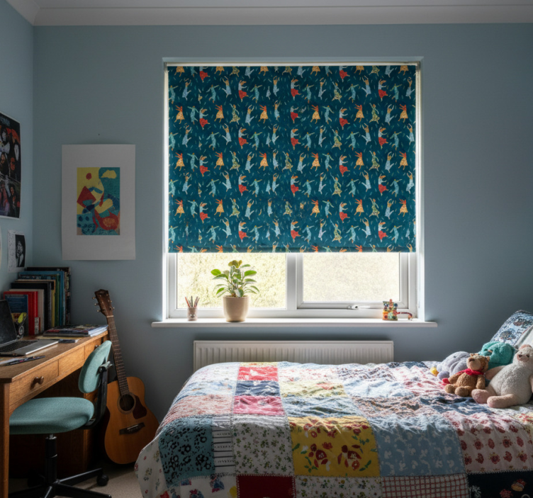 Breng leven in de slaapkamer van je tiener met ons rolgordijn tienerkamer dansende mensen! Dit unieke ontwerp toont een levendige dansende mensenmotief dat perfect past bij de energieke en creatieve geest van de tiener. De grafische elementen zijn speels en kleurrijk, waardoor het een eyecatcher is in elke kamer. Dit rolgordijn is niet alleen een praktische oplossing voor zonwering, maar ook een stijlvol decoratief element dat de ruimte transformeert!