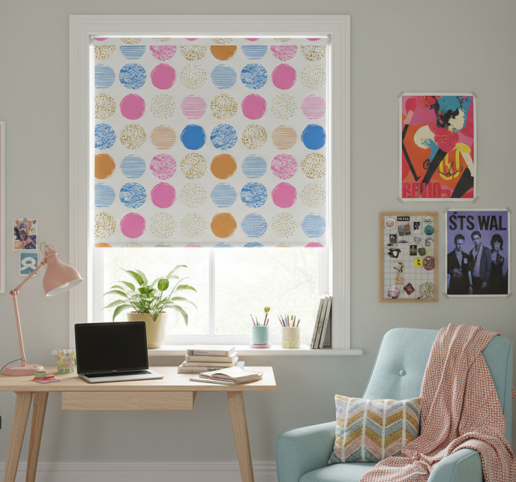 Referentienummer: E7502Rolgordijn tienerkamer gekleurde stippenpatroon