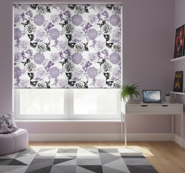 Rolgordijn tienerkamer paars en zwart bloemenpatroon