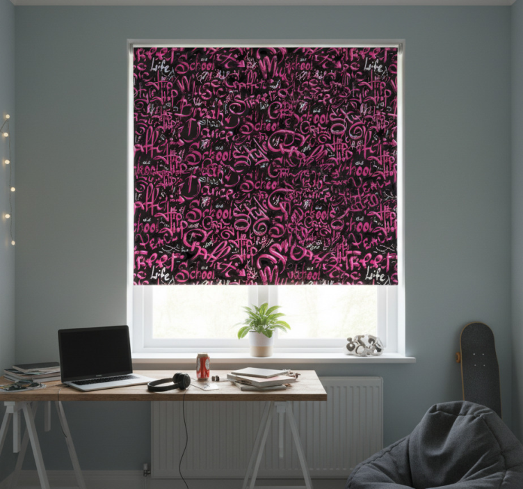 Het rolgordijn tienerkamer roze en zwarte graffiti rolgordijn tienerkamer is een uitstekende keuze voor iedereen die op zoek is naar een unieke manier om een kamer op te fleuren. Het biedt niet alleen bescherming tegen direct zonlicht, maar fungeert ook als een inspirerend decoratie-element. Met zijn gedurfde kleuren en trendy ontwerp voegt het karakter toe aan de ruimte, waardoor het een plek wordt waar jongeren zich echt thuis voelen. Dit rolgordijn maakt het mogelijk om eenvoudig de sfeer van de kamer te transformeren!