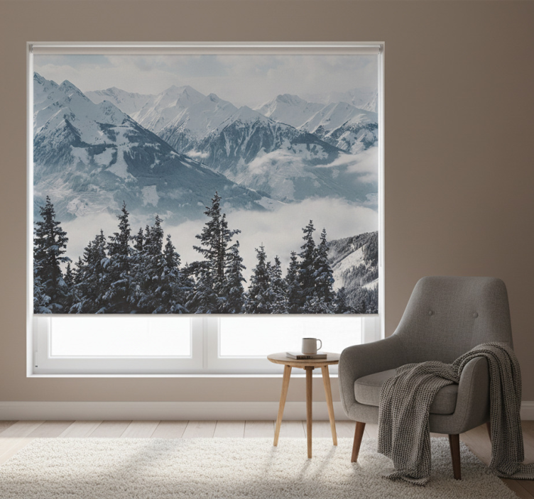 Rolgordijn woonkamer besneeuwde bergen en bomen