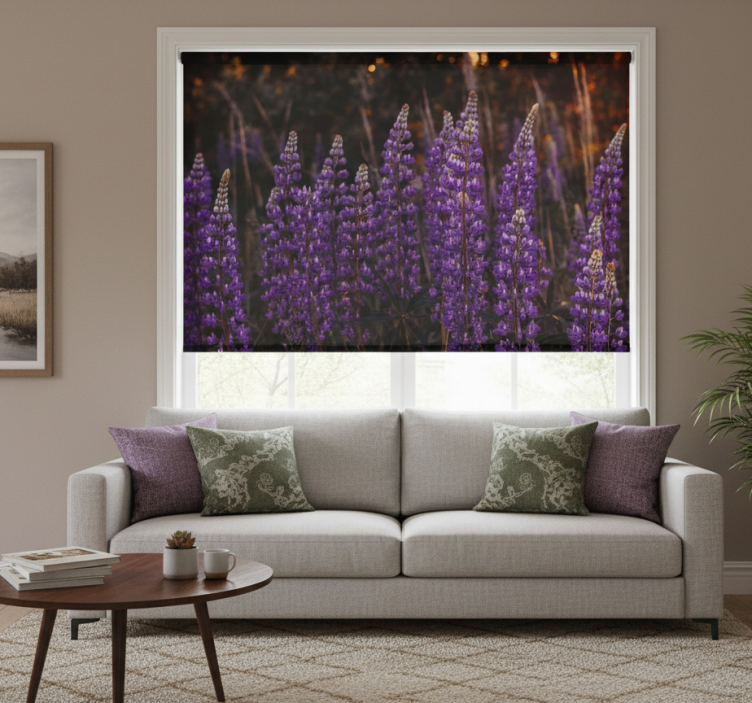 Rolgordijn woonkamer bos herleefd door paarse bloemen