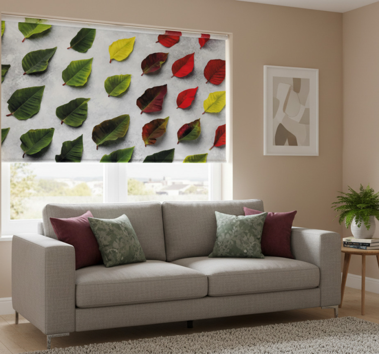 Referentienummer: E8613Maak kennis met ons unieke rolgordijn woonkamer bovenaanzicht kleurrijke bladeren