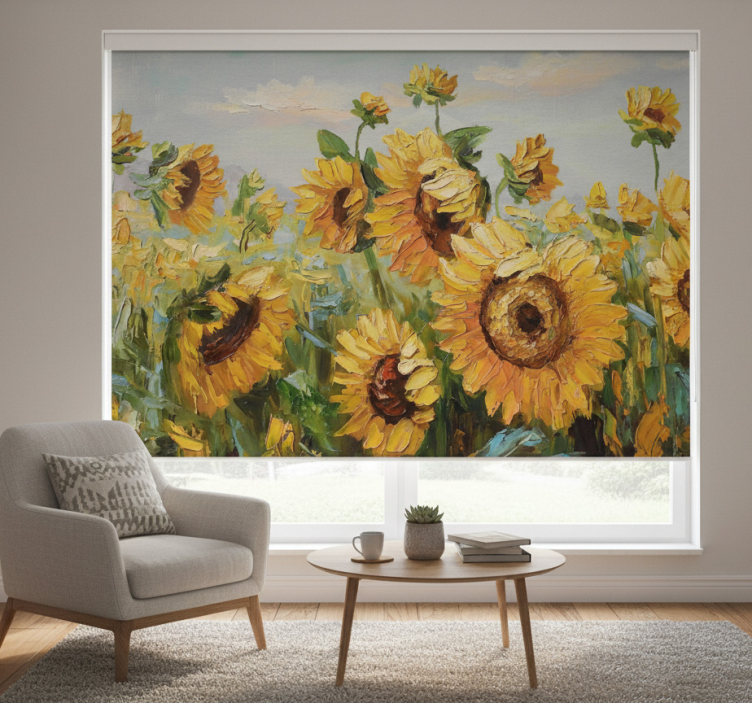 Referentienummer: E9451Rolgordijn woonkamer geschilderde zonnebloem boerderij
