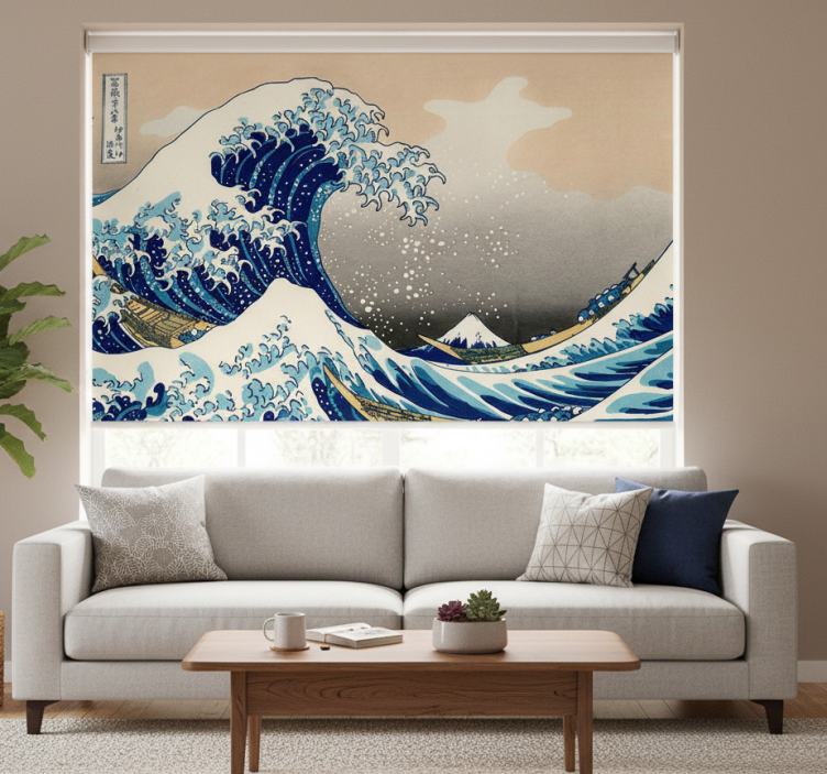 Breng een vleugje kunst in uw huis met ons rolgordijn woonkamer hokusai golf fotobehang. Dit unieke ontwerp, geïnspireerd door de beroemde Hokusai-golf, geeft een grafisch accent aan uw interieur. De levendige kleuren en de dynamische vormen zorgen voor een visueel spektakel dat zowel modern als tijdloos aanvoelt. Dit rolgordijn combineert functionaliteit met esthetiek, waardoor het een perfecte keuze is voor elke woonkamer. Met zijn elegante uitstraling en praktische voordelen, zoals het verbeteren van de decoratie van de kamer, is het een must-have voor elke woning!