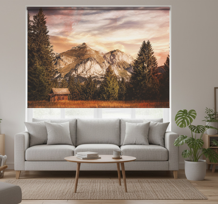 Informatie Rolgordijn woonkamer houten cabin in het bos met bergen
